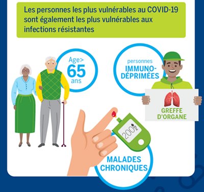 La transmission de la COVID-19 et la propagation de l’antibiorésistance peuvent également être atténuées avec votre aide. Pour empêcher la transmission de la COVID-19, il faut comprendre comment le virus se transmet. Lavez-vous souvent les mains, portez un masque dans les lieux publics et pratiquez la distanciation physique (à au moins 1 mètre) avec les personnes extérieures à votre domicile. La propagation de l'antibiorésistance peut être freinée de plusieurs manières, notamment par des mesures de prévention des infections telles que le lavage des mains et l'utilisation appropriée d'antibiotiques. Vous devez vous faire vacciner selon les recommandations de votre médecin, utiliser les antibiotiques exactement comme ils vous ont été prescrits.