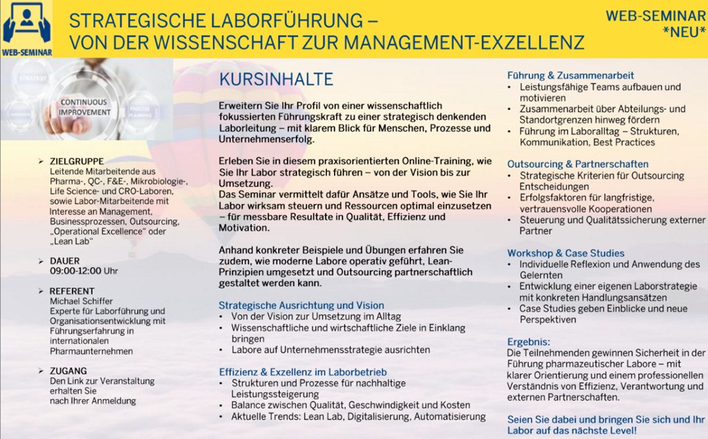 ZIELGRUPPE:Leitende Mitarbeitende aus Pharma-, QC-, F&E-, Mikrobiologie-, Life Science- und CRO-Laboren, sowie Labor-Mitarbeitende mit Interesse an Management, Businessprozessen, Outsourcing, „Operational Excellence“ oder „Lean Lab“